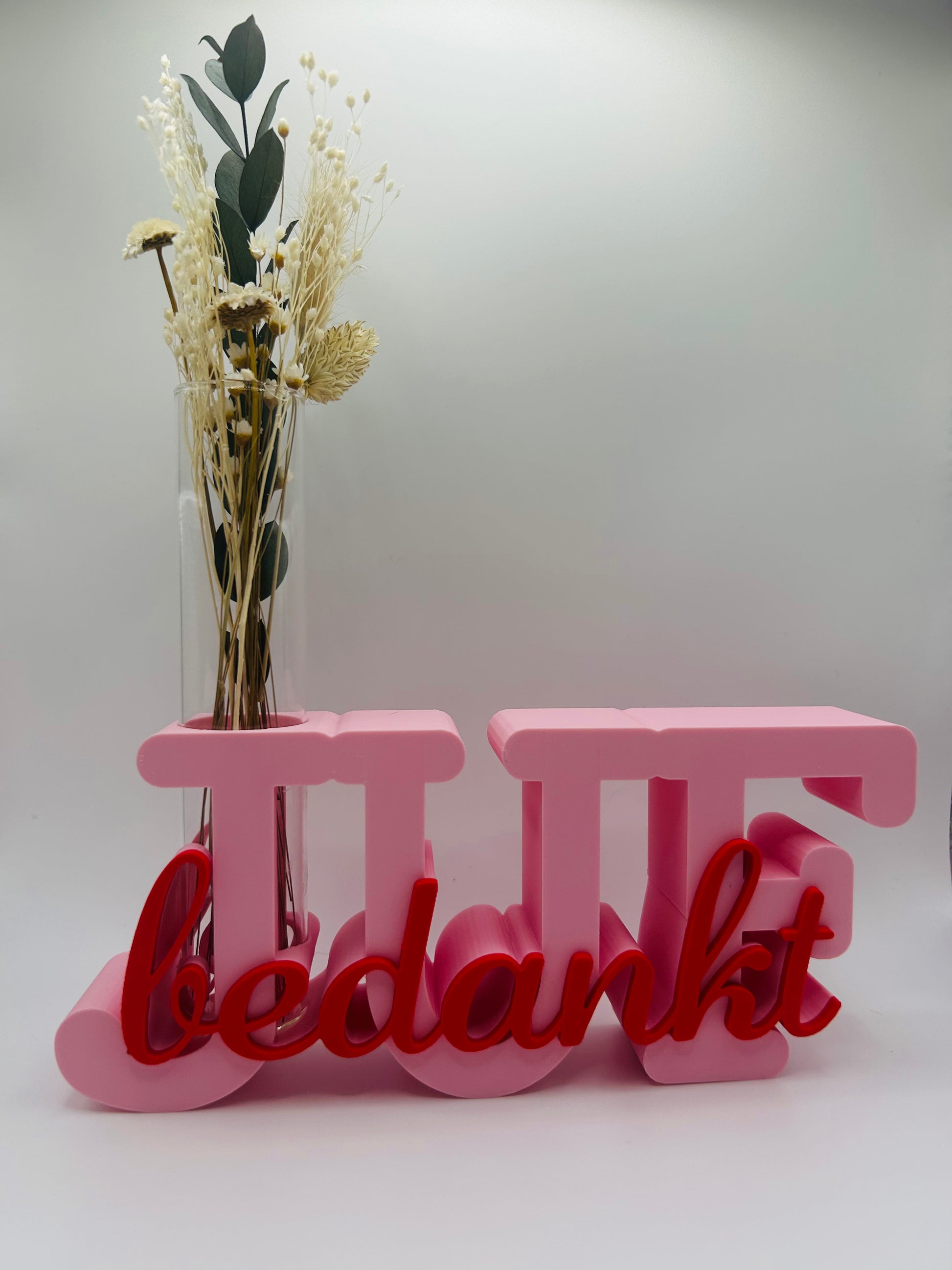 - Origineel ontwerp: De woorden Bedankt Juf gecombineerd met een schattig mini-vaasje.