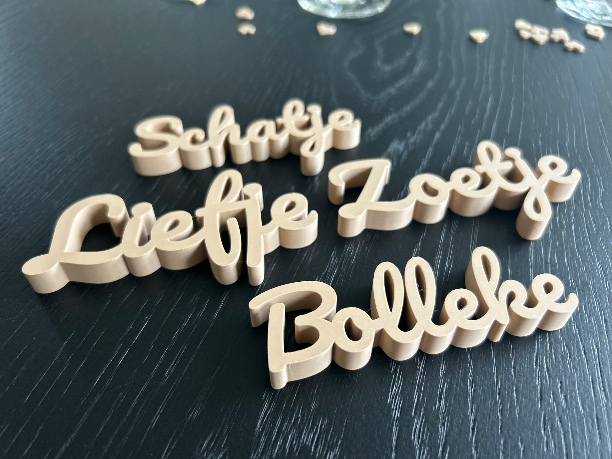 Geef je cadeau, interieur of tafelsetting een persoonlijke en liefdevolle touch met onze 3D-geprinte koosnaampjes. Perfect om iemand te verrassen of je ruimte te decoreren met een speels accent.